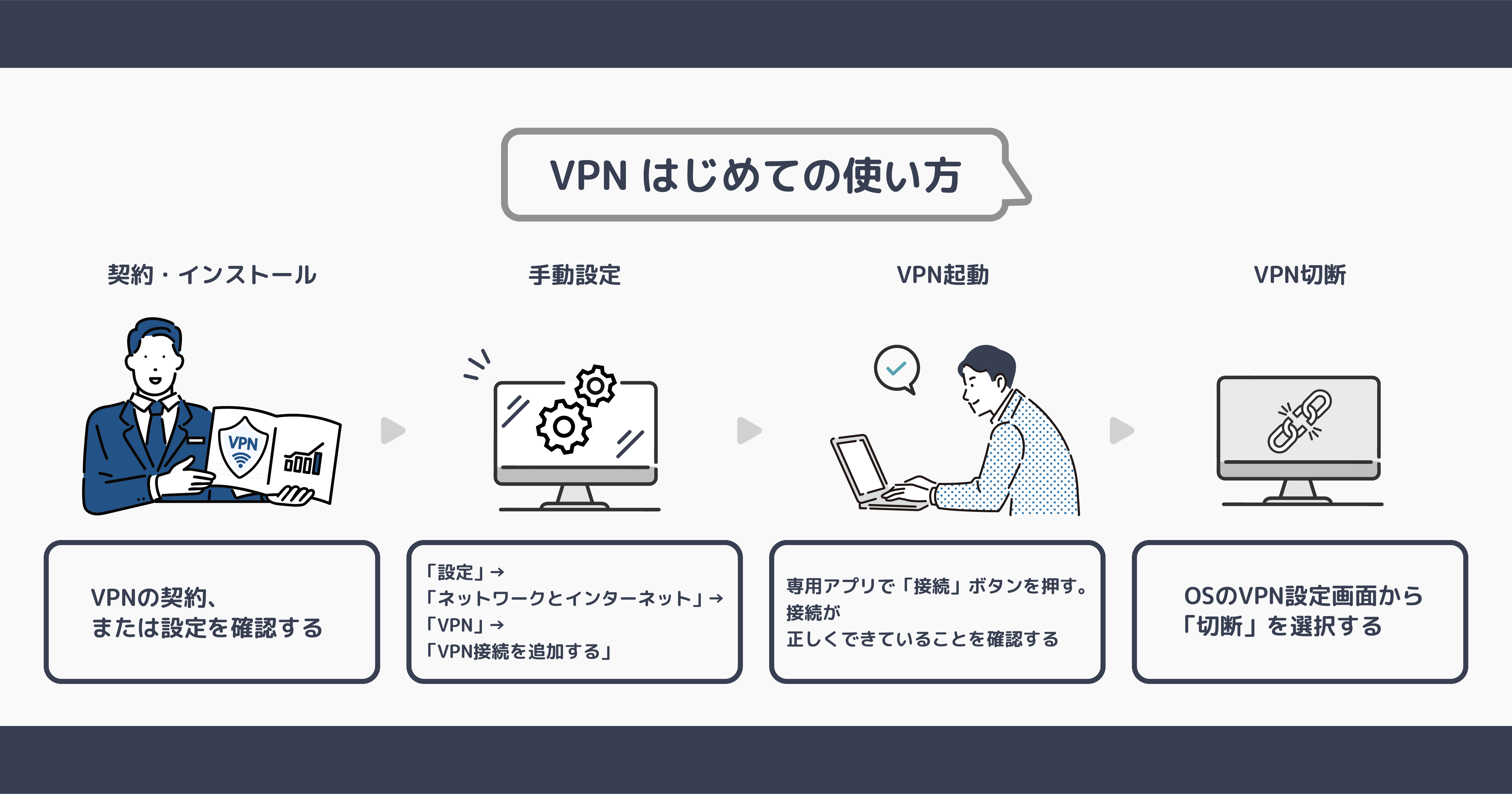 VPNを利用することで、安全にインターネットを使用したり、社内ネットワークへ接続したりすることができます。一般的なVPNの起動方法は以下のとおりです。