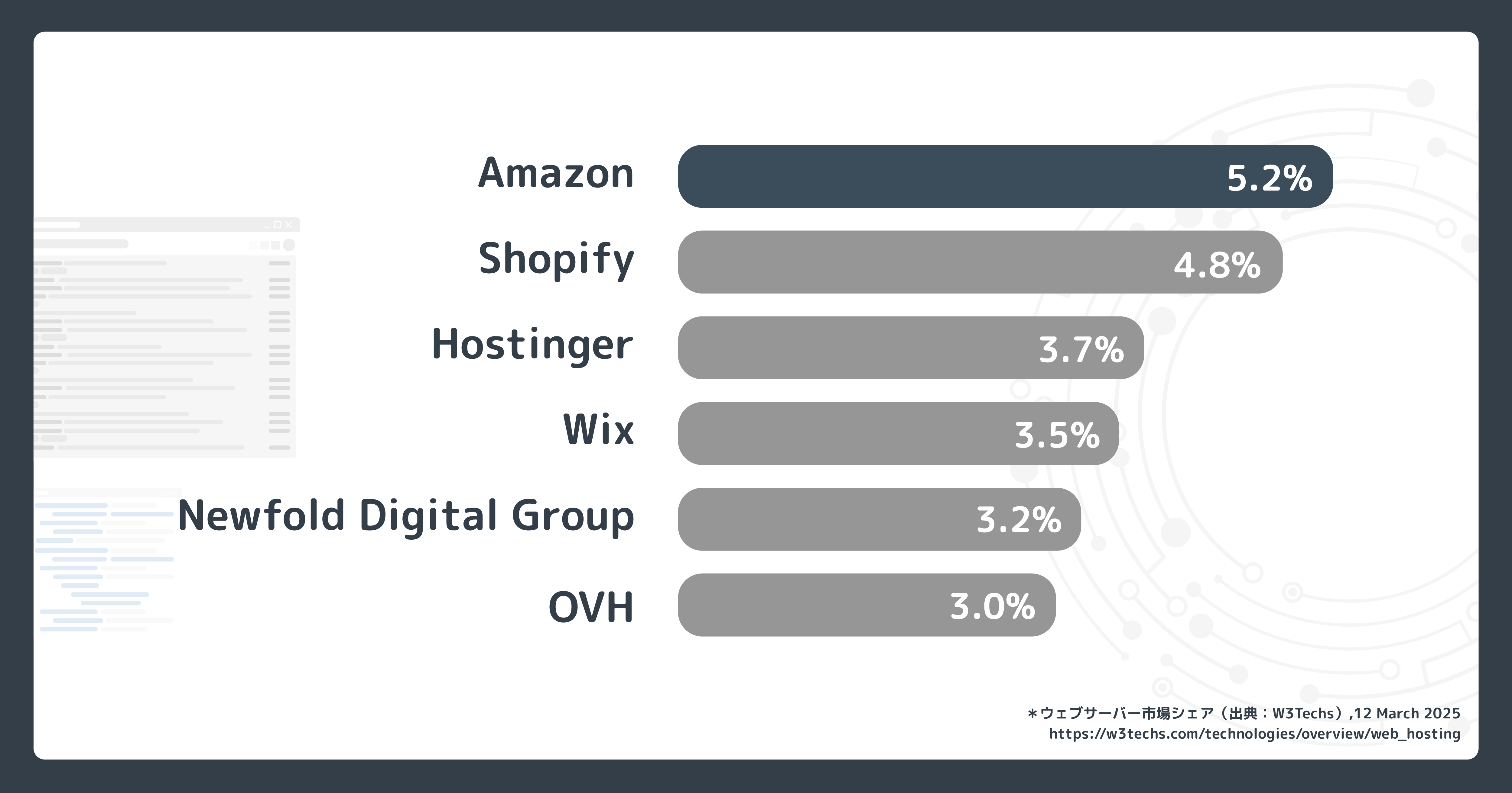 世界のウェブサーバーサービスにおける、クラウド市場シェア数は以下のとおりです。